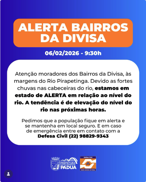 📲 Plantão Defesa Civil Pádua: (22) 98829-9343