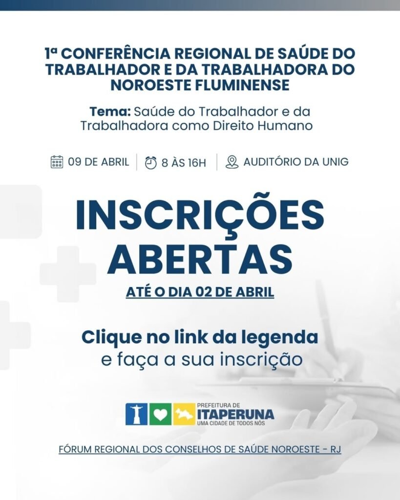 A Prefeitura de Itaperuna convida para a 1ª Conferência Regional de Saúde do Trabalhador e da Trabalhadora do Noroeste Fluminense, um evento fundamental para debater a saúde como direito humano e fortalecer políticas públicas para a proteção dos trabalhadores.
