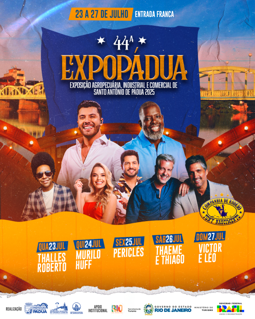 A Prefeitura de Santo Antônio de Pádua (RJ) divulgou a realização da 44ª edição da Expo Pádua – Exposição Agropecuária, Industrial e Comercial do município. O evento está programado para ocorrer entre os dias 23 e 27 de julho de 2025, com entrada gratuita.