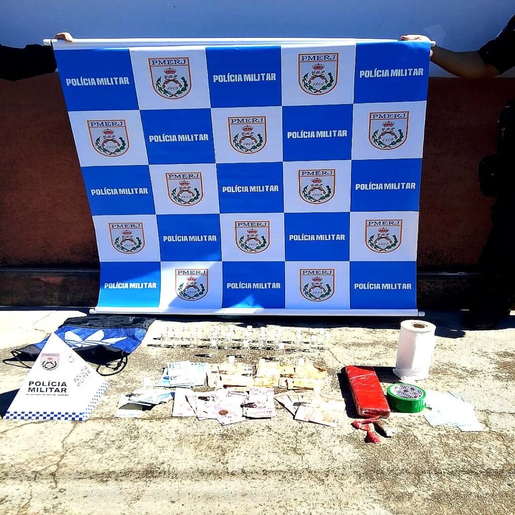 Quando chegaram ao endereço, os policiais fizeram contato com uma jovem (identificada como irmã de um dos suspeitos), que autorizou a entrada da equipe. No interior do imóvel, os agentes encontraram um dos denunciados e, após buscas, localizaram os seguintes materiais: tablete e bucha de maconha, “caça peixe”, dois papelotes de cocaína, 32 frascos vazios normalmente usados para armazenar “loló”, material utilizado para embalar drogas, fitas adesivas e sacolas plásticas, além de R$ 1.495.
