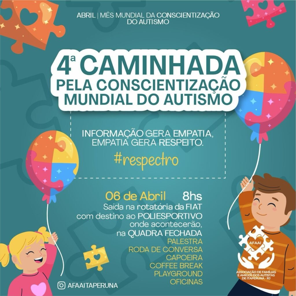 O evento é organizado pela AFAAI (Associação de Famílias e Amigos dos Autistas de Itaperuna) e integra a programação do Abril Azul, mês dedicado à conscientização sobre o Transtorno do Espectro Autista (TEA). Com o lema “Informação gera empatia, empatia gera respeito”, a iniciativa busca promover conhecimento e inclusão.