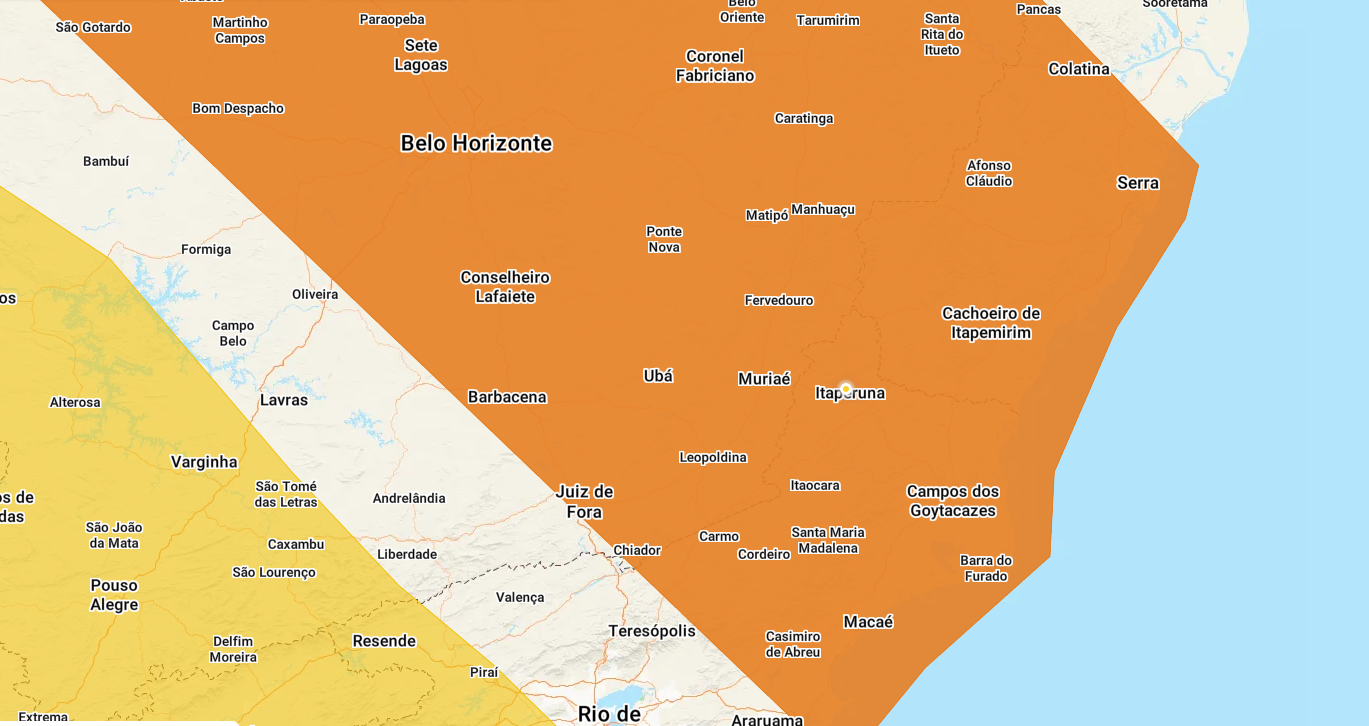 As previsões indicam condições climáticas de alto risco para cidades como Belo Horizonte, Juiz de Fora, Muriaé, Campos dos Goytacazes, Macaé, Teresópolis e Itaperuna, que estão na área de alerta.
