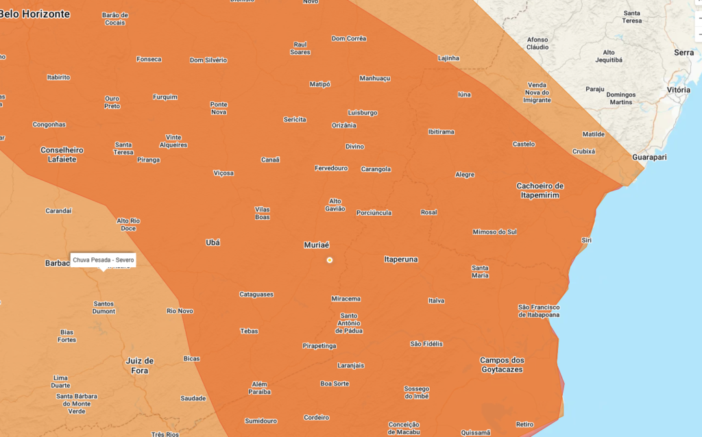 O Instituto Nacional de Meteorologia (INMET) publicou um aviso de perigo (grau severo) para chuvas intensas com início às 09:06 desta sexta-feira (23). O monitoramento aponta uma área de risco que abrange cidades como Itaperuna, Muriaé, Campos dos Goytacazes, Cachoeiro de Itapemirim e regiões vizinhas.