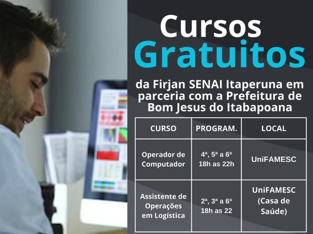 A Prefeitura de Bom Jesus do Itabapoana, por meio da Coordenadoria de Direitos Humanos, Trabalho e Renda, está com inscrições abertas para dois cursos gratuitos em parceria com o SENAI e a FAMESC. O período de inscrição vai de 1º a 5 de setembro, das 8h às 17h, na sede da Coordenadoria (Praça Governador Portela, 164 – Edifício Ferreira e Borges, salas 07 e 08 – Centro, ao lado da Casa do Artesão).