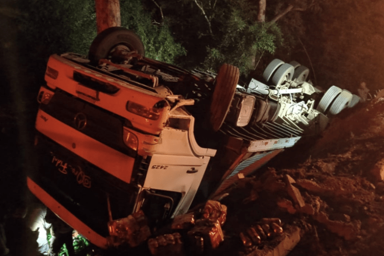 Um caminhão Mercedes-Benz 2425, carregado com bebidas alcoólicas, tombou na BR-116, em Leopoldina, por volta das 21h desta terça-feira (21). O acidente aconteceu na altura do km 777, entre a Serra da Vileta e a região conhecida como Bica D’Água.