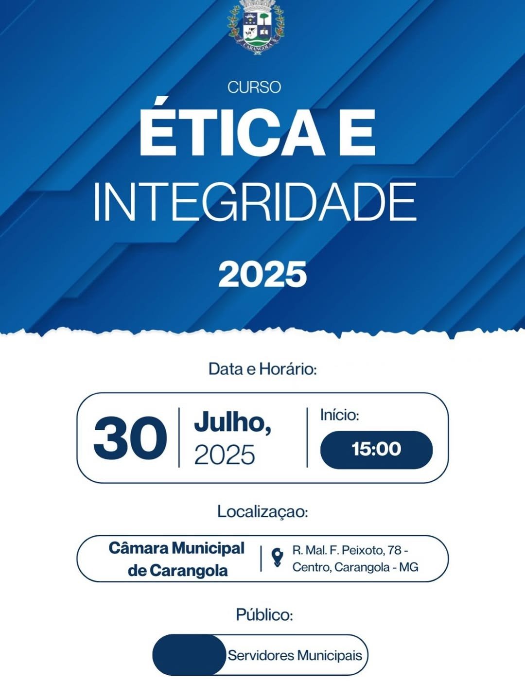 A Prefeitura de Carangola (MG) realizará no dia 30 de julho de 2025 curso para a capacitação de servidores municipais sobre o Código de Ética do Município e o Plano de Integridade.