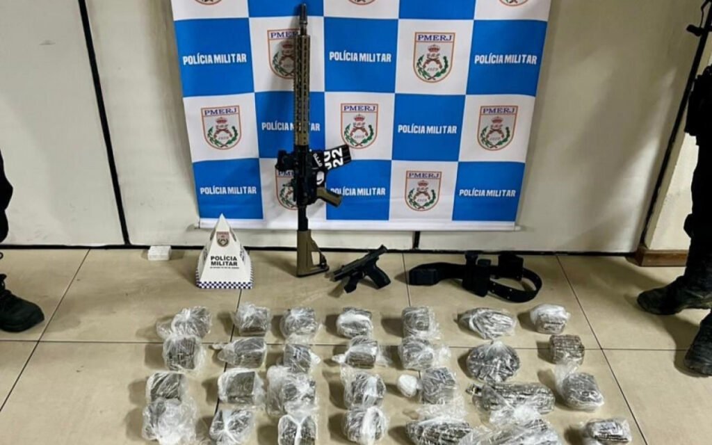 Policiais do 12º BPM (Niterói) também apreenderam um fuzil, uma réplica de fuzil, uma pistola, um rádio transmissor, carregadores com munições, 664 trouxas de maconha e um veículo.