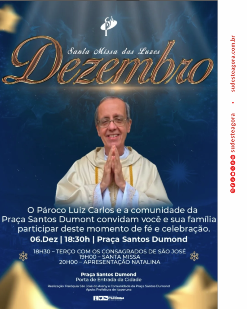 A Prefeitura de Itaperuna convida a população para participar da Santa Missa das Luzes, um momento especial de fé, união e celebração, ao lado do Pároco Luiz Carlos e da comunidade da Praça Santos Dumont.