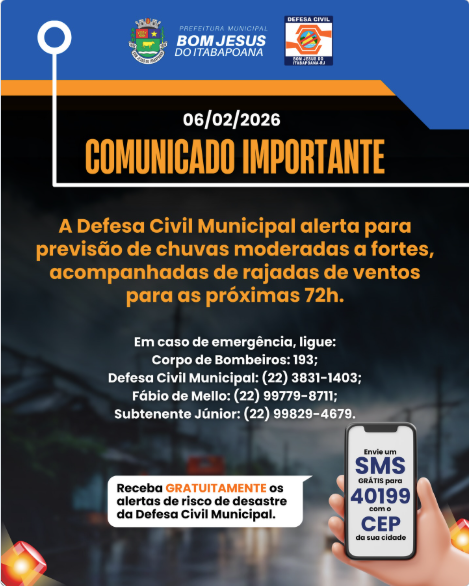 A Defesa Civil Municipal de Bom Jesus do Itabapoana emitiu, nesta sexta-feira (06), um comunicado de alerta à população em razão da previsão de chuvas de intensidade moderada a forte, acompanhadas de rajadas de vento, com possibilidade de ocorrência ao longo das próximas 72 horas.