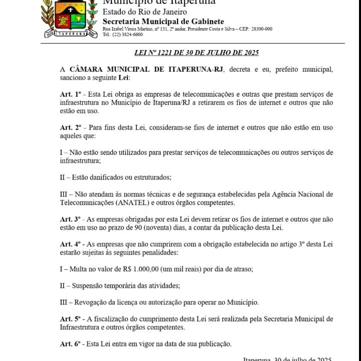 O prefeito de Itaperuna, Emanuel Medeiros da Silva, o Nel, sancionou uma lei que obriga as empresas de telecomunicações e demais prestadoras de serviços de infraestrutura no município a removerem fios soltos.