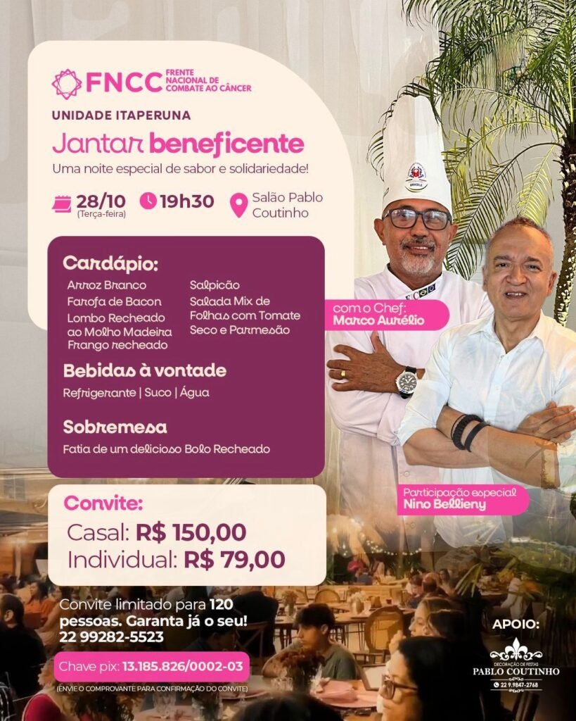 A unidade da Frente Nacional de Combate ao Câncer (FNCC) em Itaperuna realiza, nesta terça-feira (28/10), às 19h30, um jantar beneficente no Salão Pablo Coutinho, com o objetivo de arrecadar recursos para fortalecer o atendimento gratuito a pacientes em tratamento oncológico no município e região.