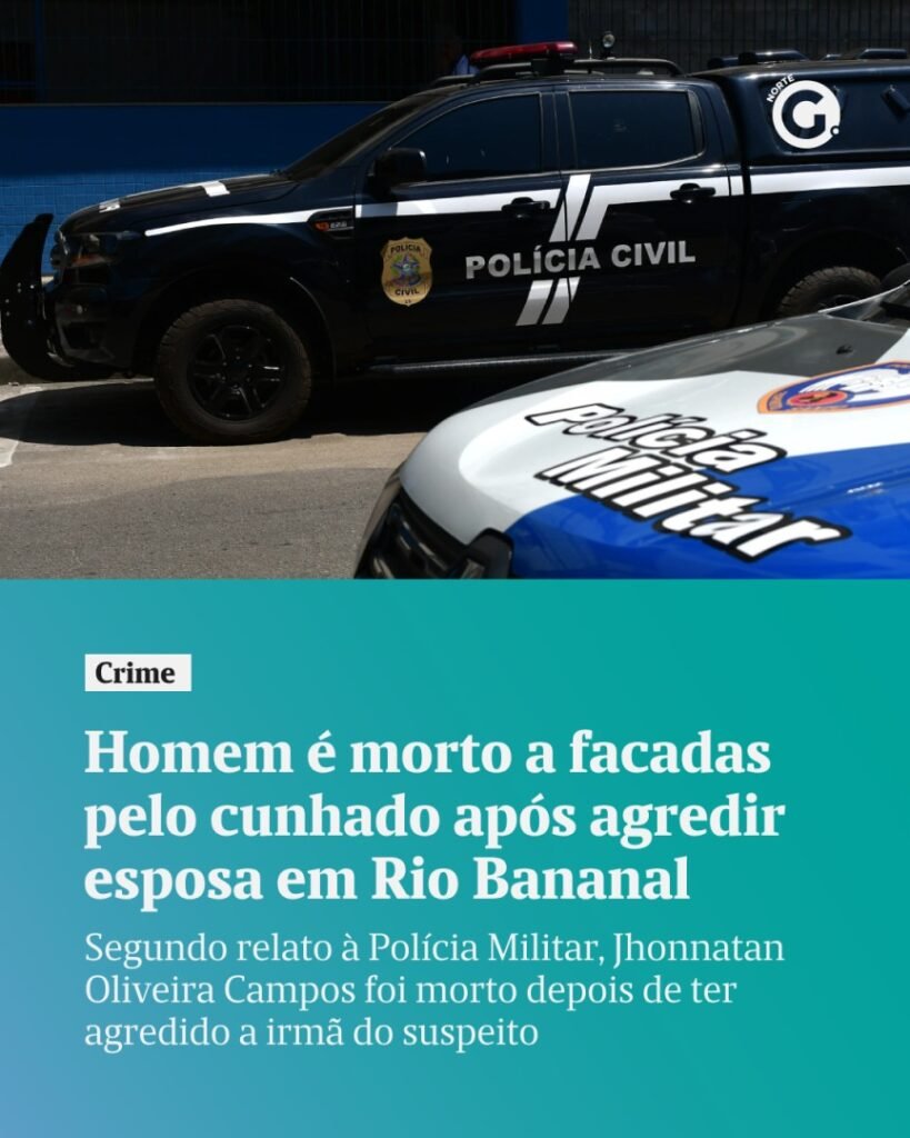 Um homem foi morto a facadas pelo cunhado na zona rural de Rio Bananal, na noite de sexta-feira (9). Segundo a Polícia Militar, a esposa da vítima contou que o irmão dela, Lucas Rodrigues, desferiu golpes de faca contra Jhonnatan após um desentendimento entre o casal.