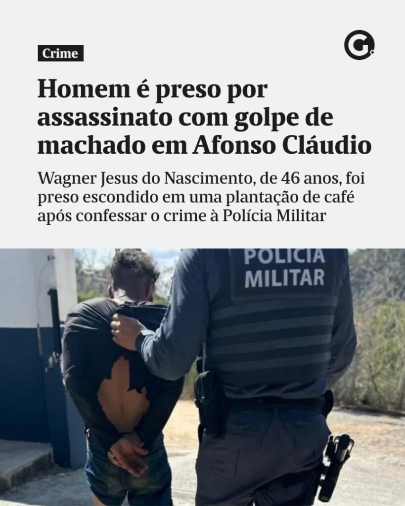 🚓 Um homem de 33 anos, identificado como Marcos Antônio da Conceição Silva, foi morto com um golpe de machado na cabeça na tarde do último sábado (20), na localidade de Vista Alegre, em Afonso Claudio, na Região Serrana do Espírito Santo. O suspeito, identificado pela Polícia Militar como Wagner Jesus do Nascimento, de 46 anos, foi preso escondido em uma plantação de café na manhã do último domingo (21).⠀