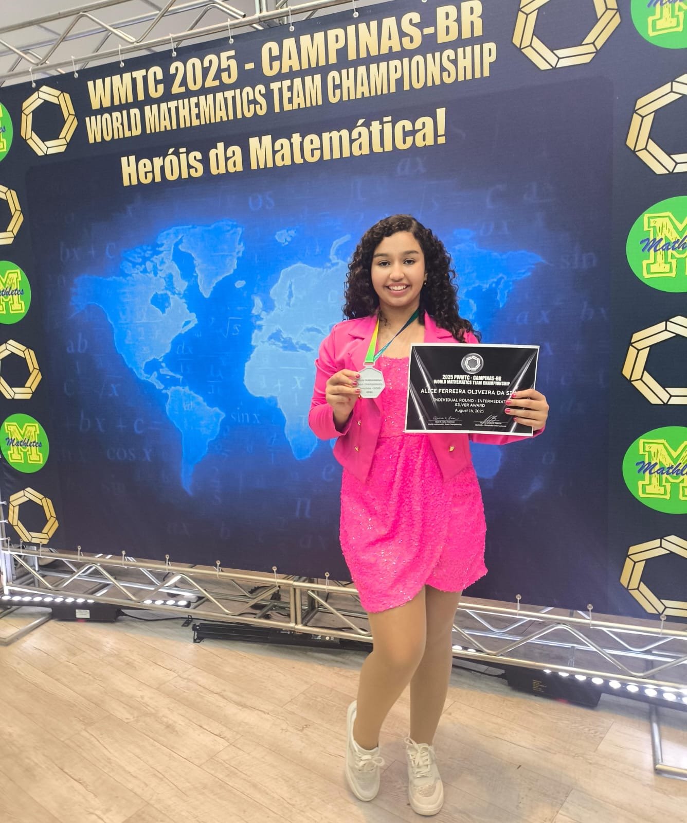 Recentemente, Alice conquistou a medalha de prata na Olimpíada Internacional de Matemática (WMTC – World Math Team Championship), realizada em Campinas. Pelo desempenho, foi classificada para a etapa mundial da competição, que acontece em dezembro, na Tailândia.