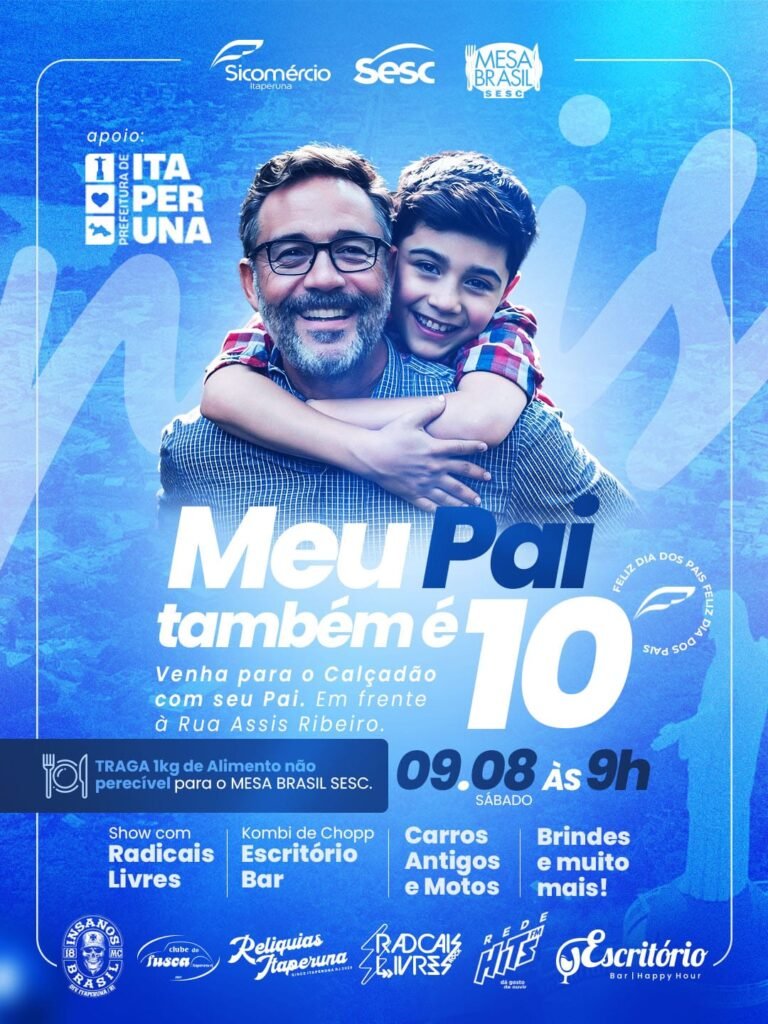 No próximo dia 9 de agosto, sábado, às 9h, ocorrerá o evento “Meu Pai também é 10” no Calçadão, em frente à Rua Assis Ribeiro, em Itaperuna-RJ. A iniciativa é promovida pelo Sicomércio Itaperuna, SESC e Mesa Brasil SESC, com o apoio da Prefeitura de Itaperuna.
