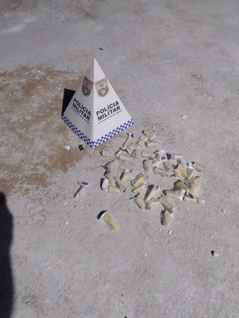Ela estava com uma criança no colo quando foi questionada sobre o que carregava. A suspeita então entregou uma sacola plástica contendo 38 pinos de cocaína prontos para a venda.