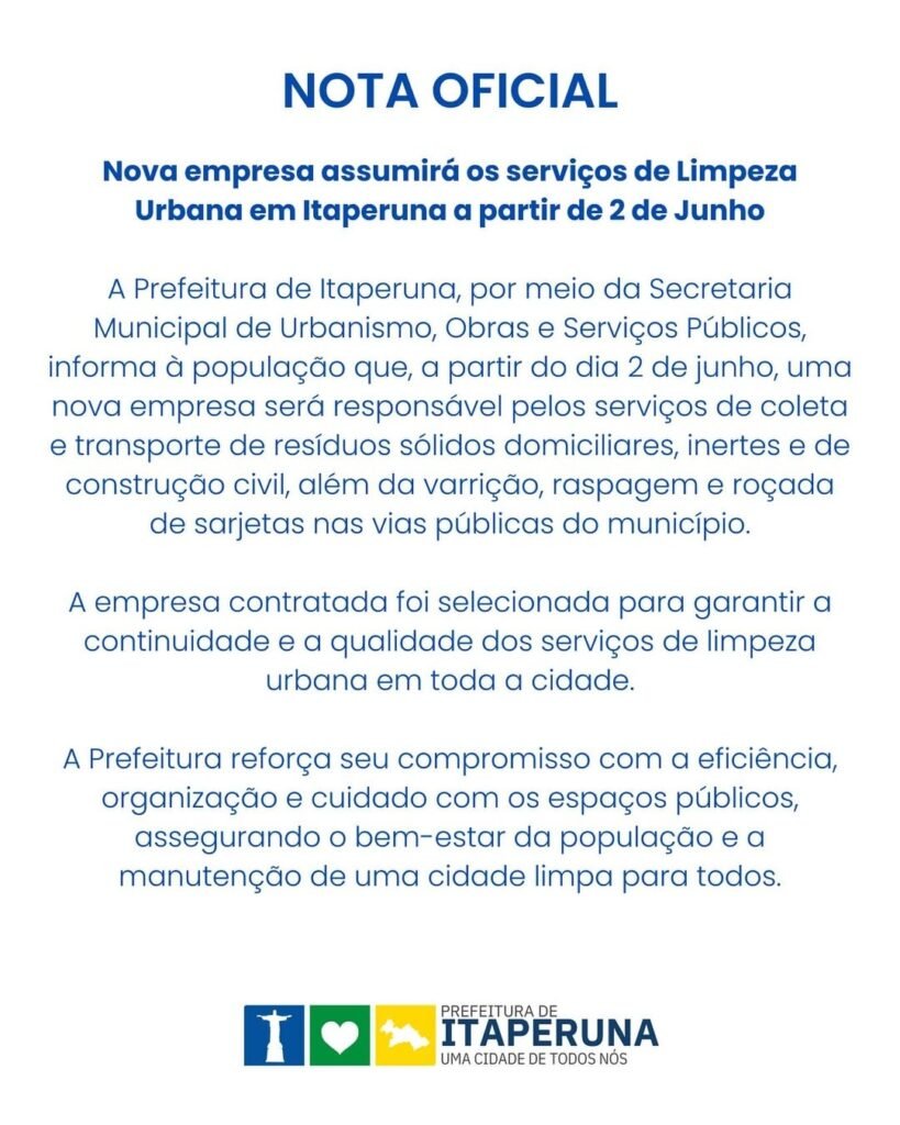 A Prefeitura de Itaperuna, por meio da Secretaria Municipal de Urbanismo, Obras e Serviços Públicos, informa à população que, a partir do dia 2 de junho, uma nova empresa será responsável pelos serviços de coleta e transporte de resíduos sólidos domiciliares, inertes e de construção civil, além da varrição, raspagem e roçada de sarjetas nas vias públicas do município.