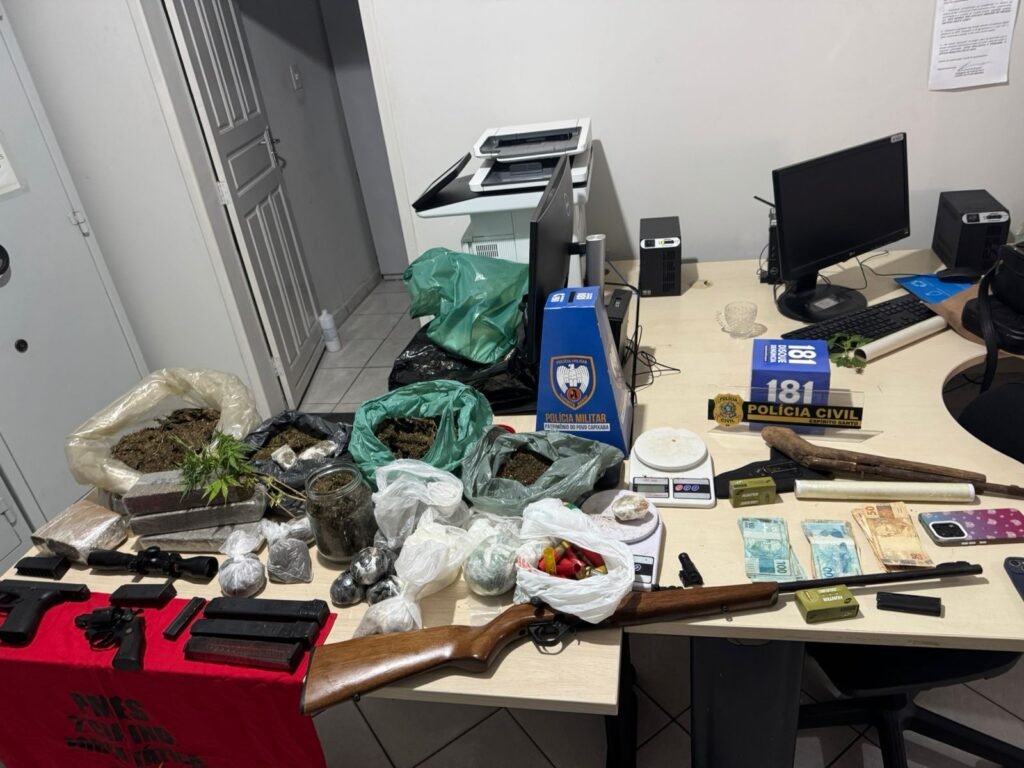 Foram encontrados ainda três prolongadores de carregadores, duas lunetas, duas porções de maconha, dois quilos e setecentos gramas de maconha fragmentada. Apreenderam-se também unidades de substância análoga ao haxixe, 315 gramas de maconha, 665 gramas de cocaína, uma pedra de crack e seis unidades de maconha.