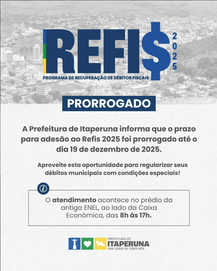 A Prefeitura de Itaperuna anunciou a prorrogação do prazo para adesão ao Programa de Recuperação Fiscal (Refis) 2025. Os contribuintes poderão regularizar débitos municipais até o dia 19 de dezembro de 2025.