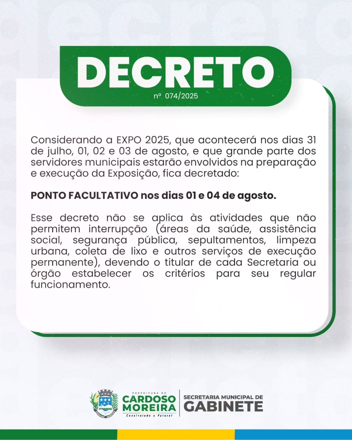 Considerando a EXPO 2025, que acontecerá nos dias 31 de julho, 01, 02 e 03 de agosto, e que grande parte dos servidores municipais estarão envolvidos na preparação e execução da Exposição, fica decretado: