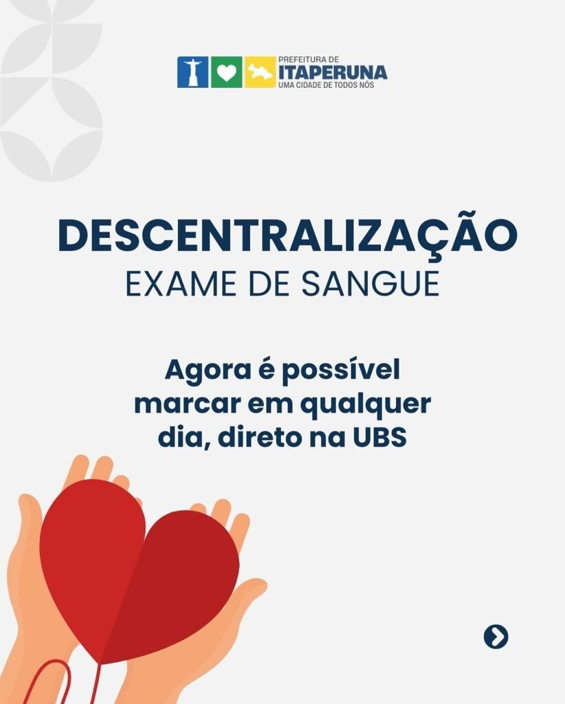 A Prefeitura de Itaperuna, por meio da Secretaria de Saúde, segue avançando na descentralização dos serviços. Agora, a solicitação do exame de sangue pode ser feita diretamente na UBS, durante todos os dias e horário de funcionamento — das 7h às 16h!
