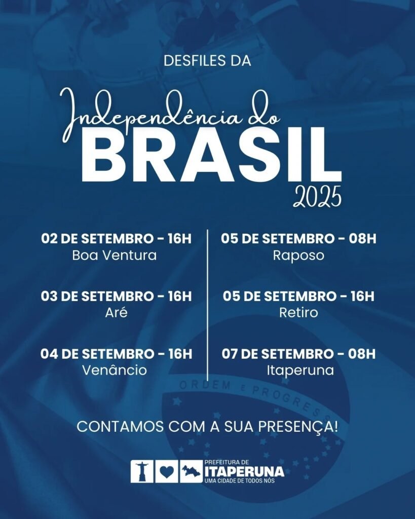 A Prefeitura de Itaperuna convida toda a população para prestigiar os Desfiles Cívicos da Independência 2025, que será celebrado pelas escolas municipais e comunidade.