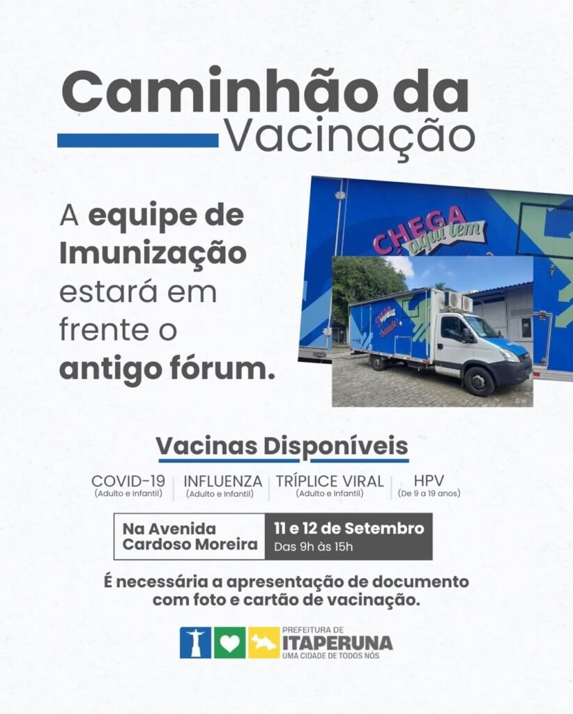 A Prefeitura de Itaperuna informa que o Caminhão da Vacinação estará disponível para atendimento à população nos dias quinta-feira (11) e sexta-feira (12) de setembro, na Avenida Cardoso Moreira, em frente ao antigo fórum, no Centro da cidade, das 9h às 15h.