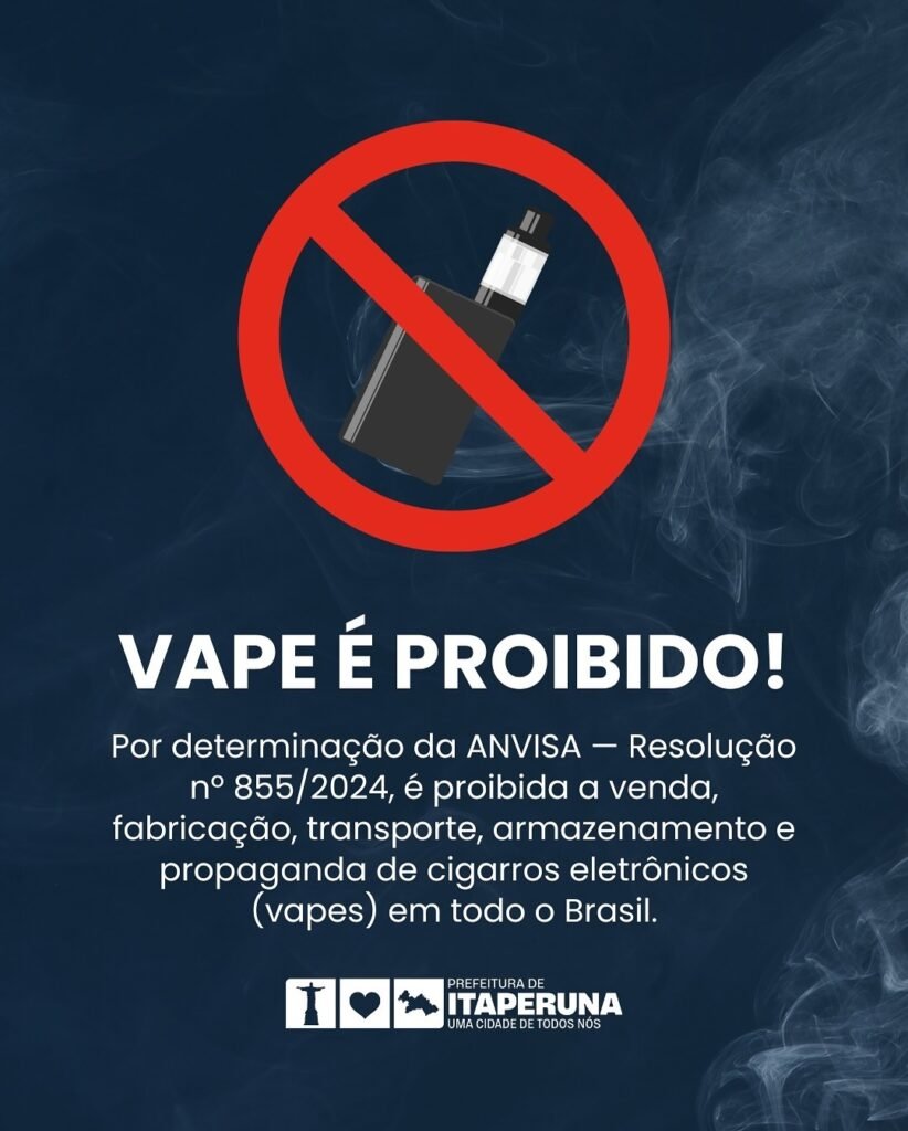 Por determinação da ANVISA — Resolução nº 855/2024, está PROIBIDA em todo o país a fabricação, comercialização, importação, transporte, armazenamento, distribuição e propaganda dos Dispositivos Eletrônicos para Fumar (DEFs) — conhecidos como cigarros eletrônicos, vapes e similares.
