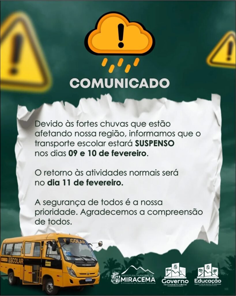 Devido às fortes chuvas que estão afetando nossa região, informamos que o transporte escolar estará SUSPENSO nos dias 09 e 10 de fevereiro.