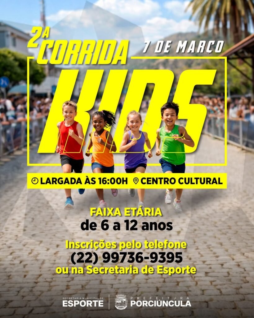A Secretaria de Esporte de Porciúncula já abriu as inscrições para a 2ª Corrida Kids 2026, para crianças de 6 a 12 anos. A competição acontece no dia 07 de março, com largada na Praça Antônio Amado, às 16h, próximo ao Centro Cultural.