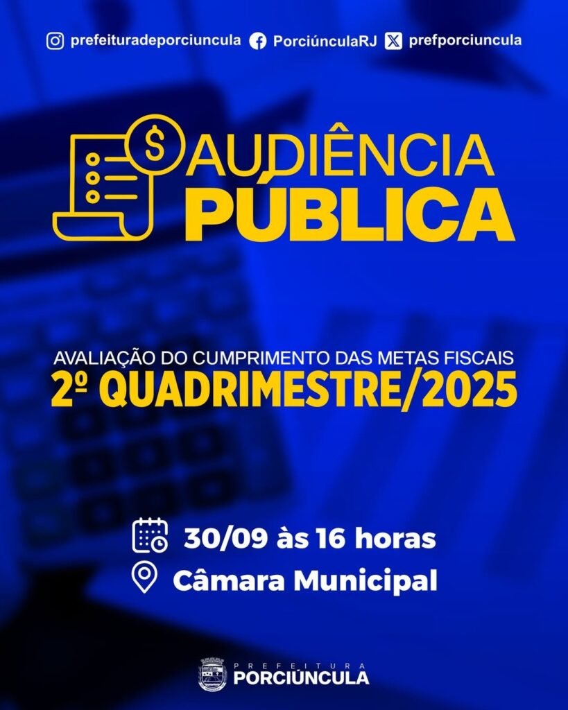 A Prefeitura de Porciúncula convida a população para a Audiência Pública de Prestação de Contas do 2° quadrimestre de 2025, que será realizada no dia 30 de setembro às 16h no plenário da Câmara Municipal de Vereadores, na Rua César Vieira, 105 – Centro – Porciúncula.