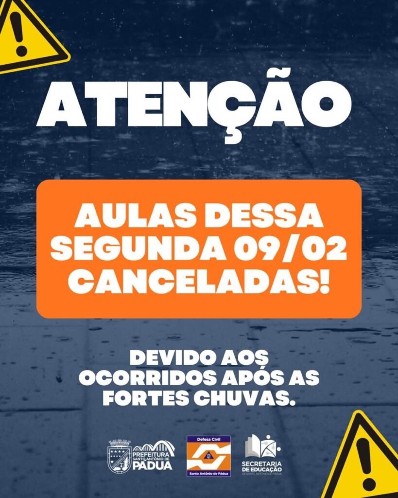 A Prefeitura de Santo Antônio de Pádua informou o cancelamento das aulas nesta segunda-feira, 09 de fevereiro, em razão dos impactos causados pelas fortes chuvas que atingiram o município nas últimas horas.