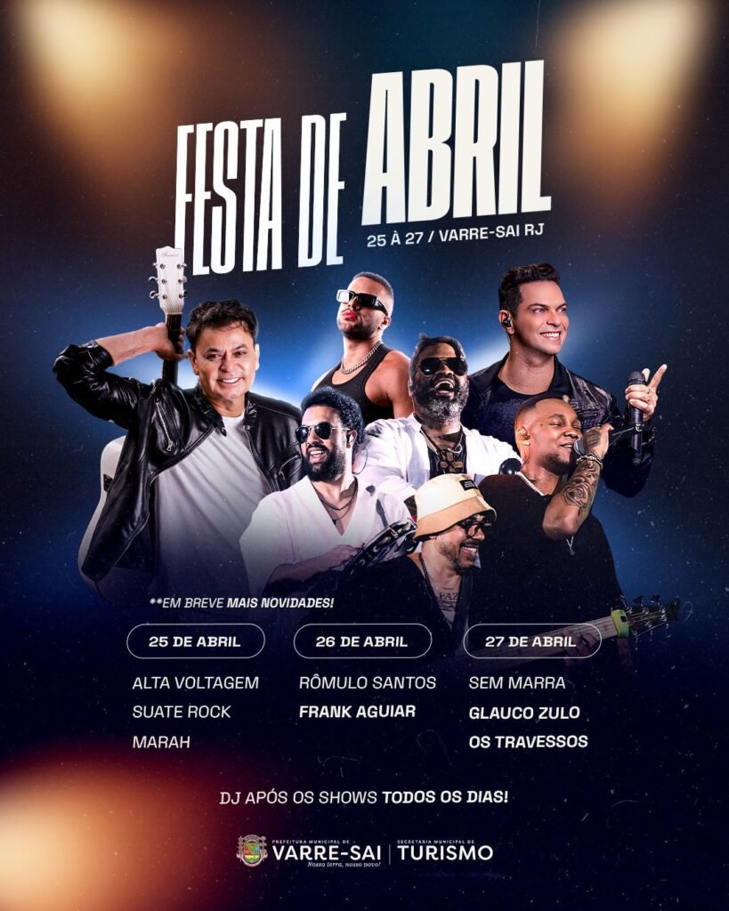 Nesta sexta-feira (04), a Prefeitura Municipal de Varre-Sai divulgou oficialmente a programação da aguardada Festa de Abril, que será realizada entre os dias 25 e 27 de abril, no município do Noroeste Fluminense.