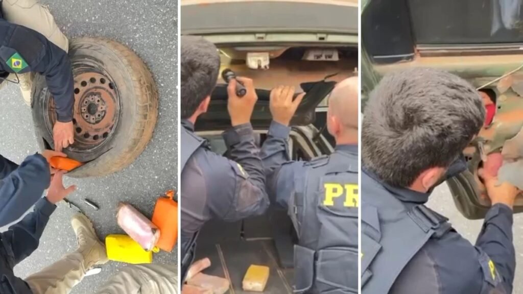 Durante a busca, os agentes da PRF encontraram parte da droga em um compartimento na lateral do porta-malas encoberto por forros. O restante estava escondido no espaço do estepe. Foram localizados diversos tabletes de pasta base de cloridrato de cocaína.