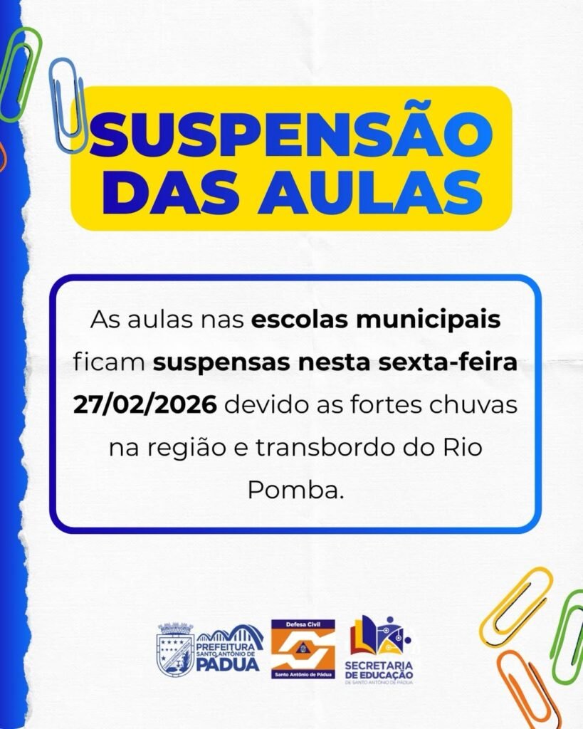 A Prefeitura de Santo Antônio de Pádua (RJ) confirmou a suspensão de todas as atividades escolares na rede municipal de ensino nesta sexta-feira, 27 de fevereiro de 2026. A medida, tomada em caráter de urgência pela Secretaria Municipal de Educação, responde à rápida elevação do Rio Pomba, que ultrapassou a cota de transbordo durante a madrugada após os temporais que atingiram as cabeceiras em Minas Gerais e o próprio Noroeste Fluminense.