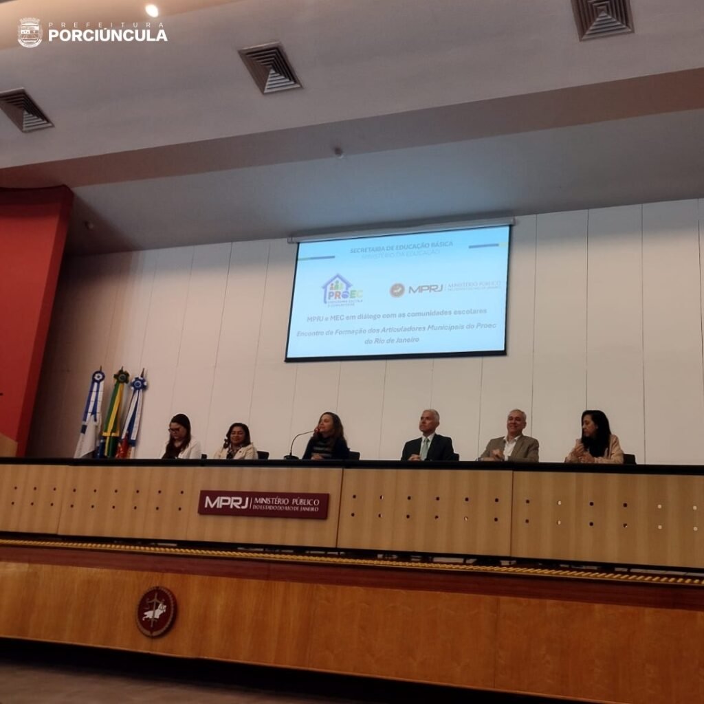 Membros da Secretaria Municipal de Educação de Porciúncula estiveram presentes no Encontro de Formação dos Articuladores Municipais do Programa Escola e Comunidade (Proec), que aconteceu no dia 27 de agosto, na sede do Ministério Público do Rio de Janeiro, com o tema: “MPRJ e MEC em diálogo com as comunidades escolares”.