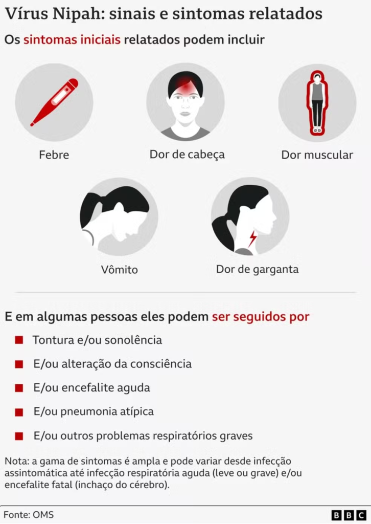 A infecção pelo vírus Nipah é uma doença zoonótica — que são transmitidas de animais como porcos e morcegos frugívoros para humanos, de acordo com a OMS.