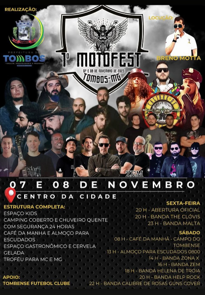 Nos dias 7 e 8 de novembro, o município de Tombos (MG) receberá a primeira edição do MotoFest, evento que promete movimentar o Centro da Cidade com uma programação voltada ao público motociclista e à comunidade em geral. A iniciativa é realizada pela Prefeitura Municipal de Tombos e conta com o apoio do Tombense Futebol Clube.